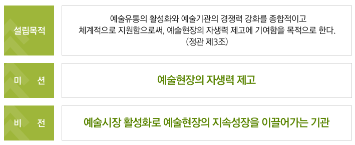 * 비전: 예술의 가치를 높이고, 예술 생태계를 건강하게 만드는 선도 기관