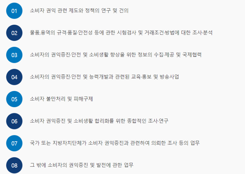 • 피해 구제 및 분쟁 조정: 소비자 피해 상담 및 처리, 분쟁 조정, 소송 지원 등